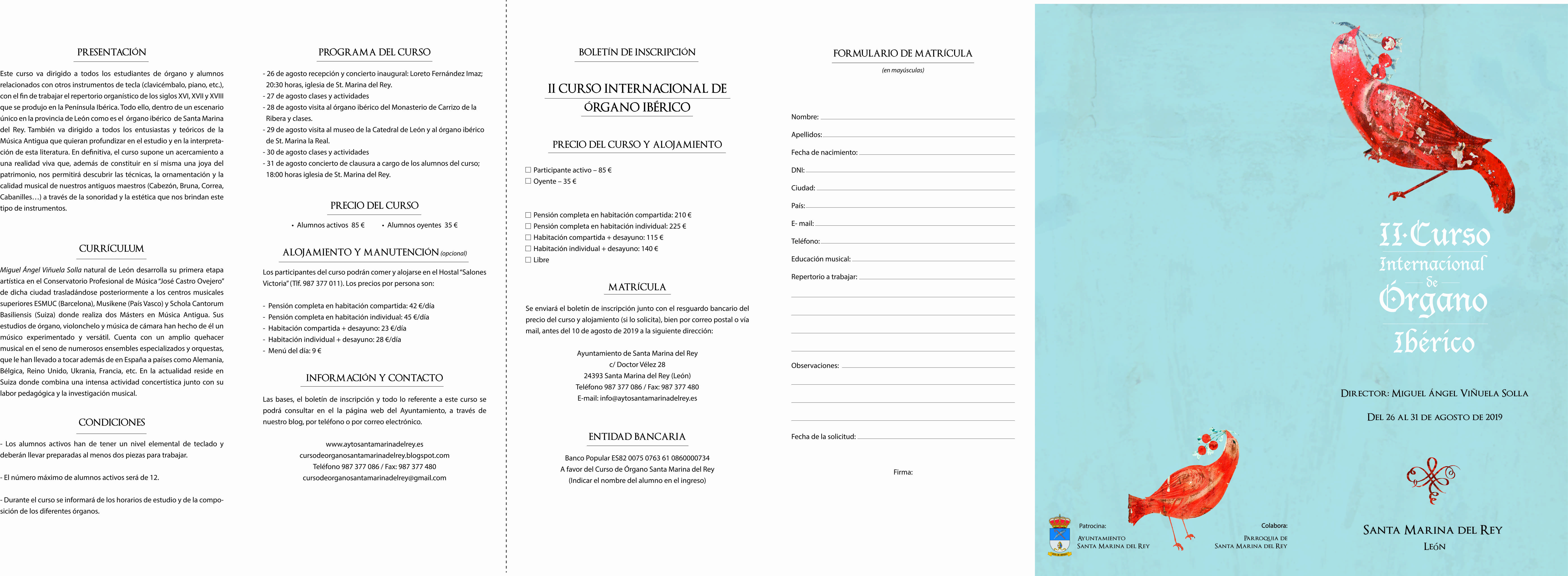 Este curso va dirigido a todos los estudiantes de órgano y alumnos relacionados con otros instrumentos de tecla, con el fin de trabajar el repertorio organístico de los siglos XVI y XVII, que se produjo en la Península Ibérica, dentro de un escenario único en la provincia de León como es el órgano de Santa Marina del Rey . También va dirigido a todos los entusiastas y teóricos de la Música Antigua que quieran profundizar en el estudio y en la interpretación de esta literatura. Los alumnos activos han de tener un nivel elemental de teclado y deberán llevar preparadas al menos dos piezas para trabajar.